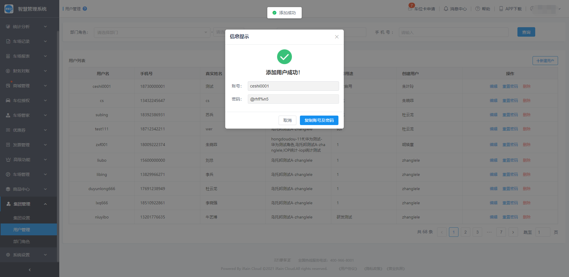 用户创建成功后,可以复制账号及密码发送给相应的人员;