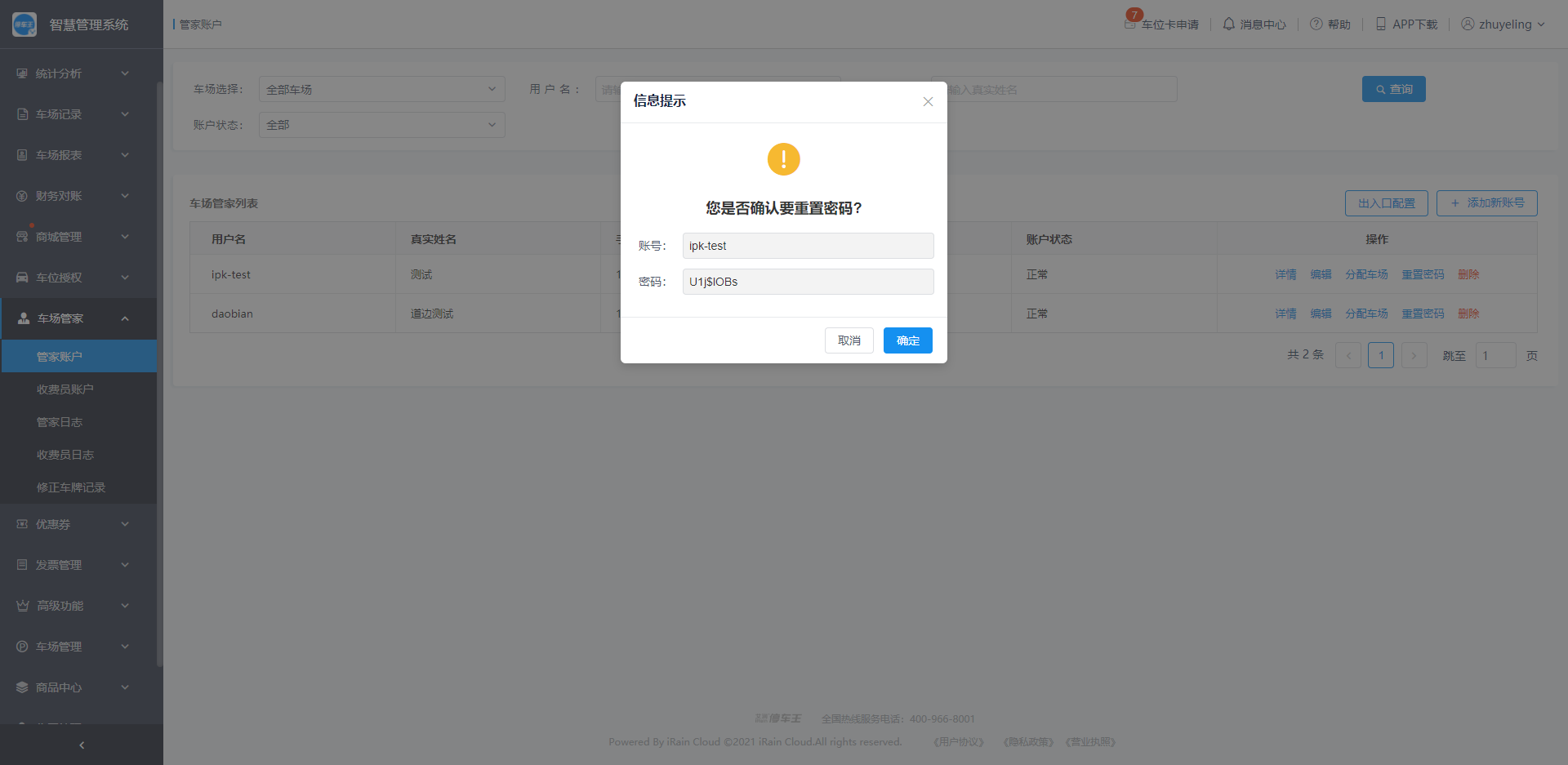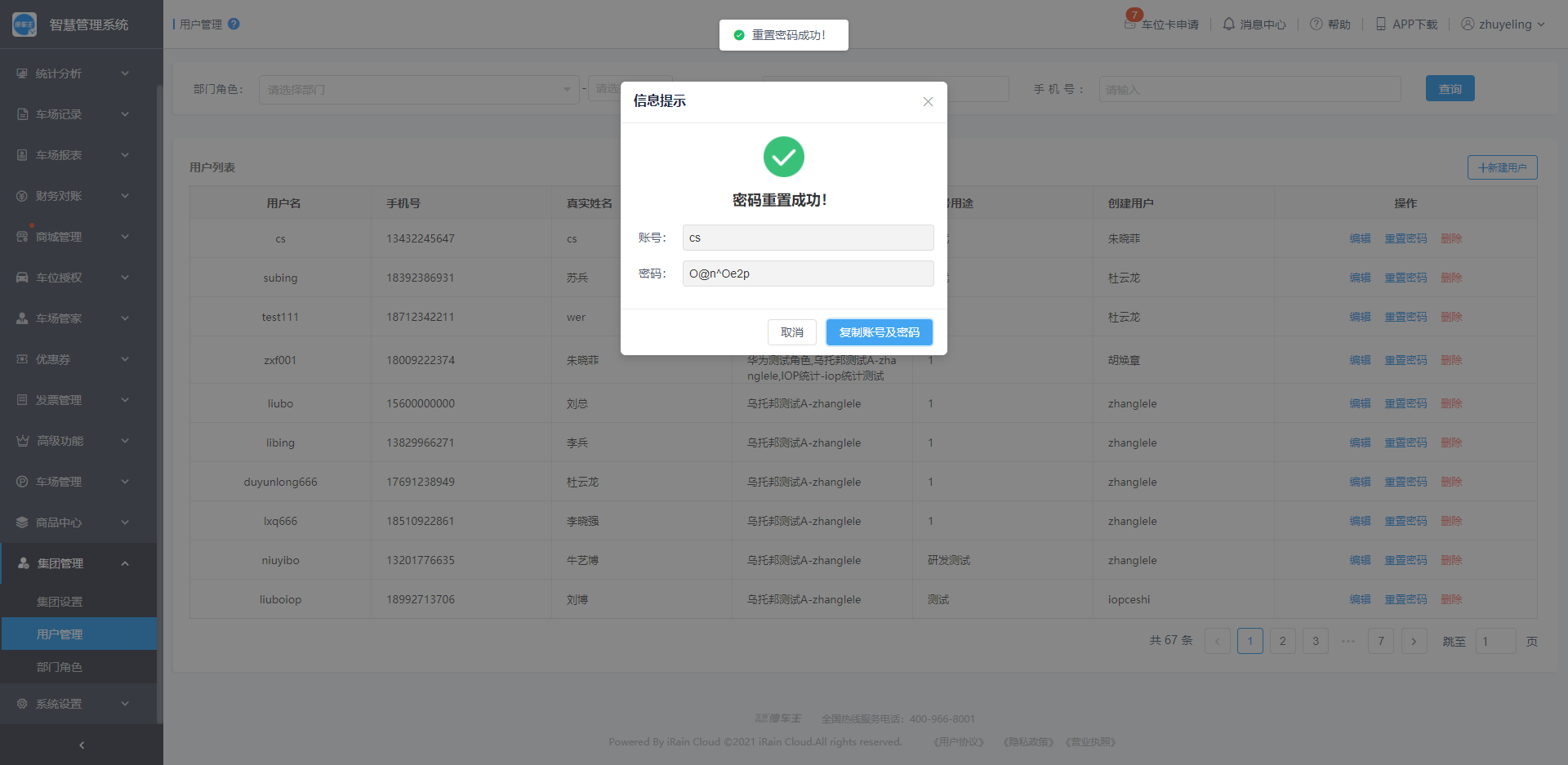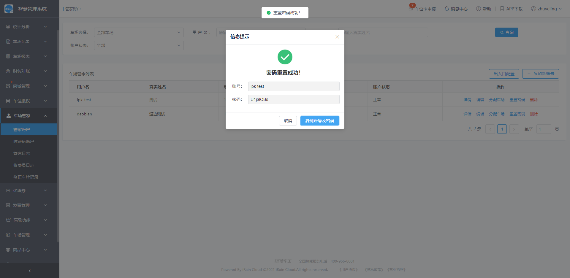 密码重置成功后,可以将账号和密码复制发送给相应的管家人员;