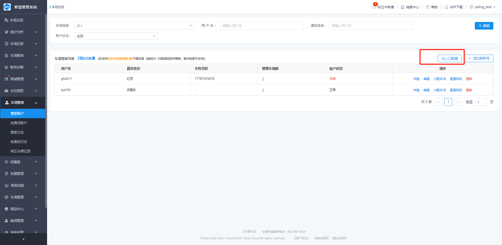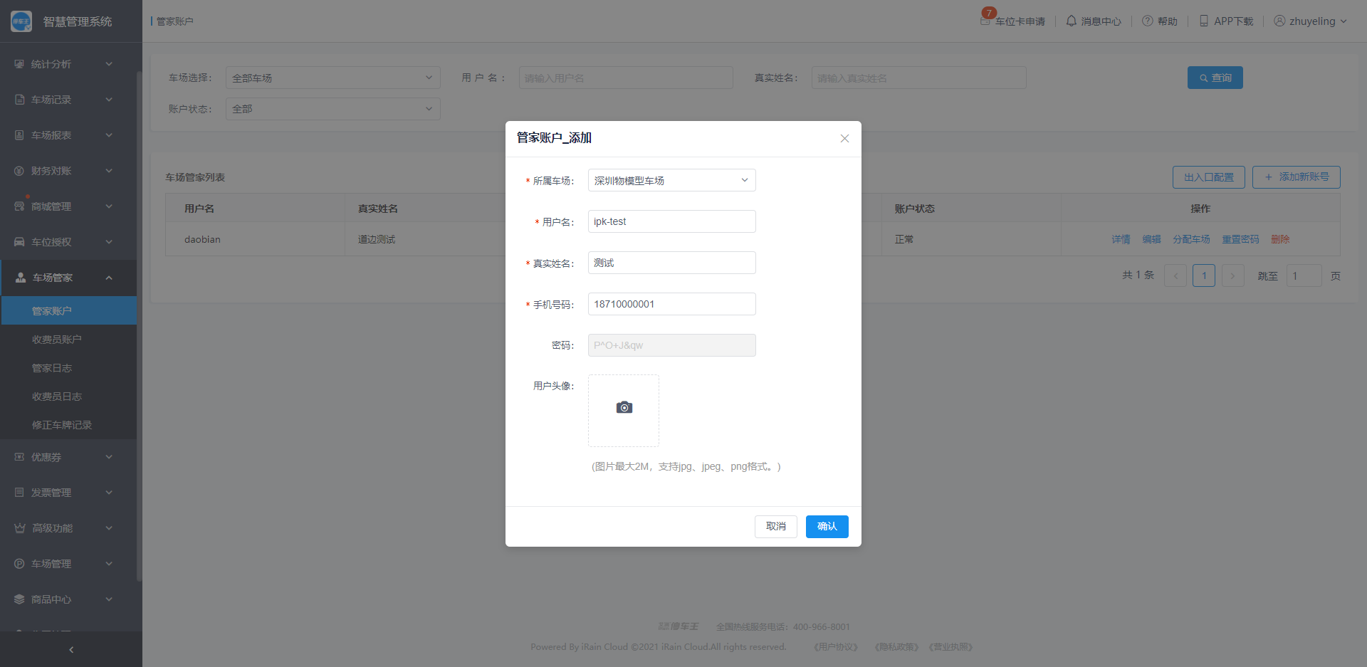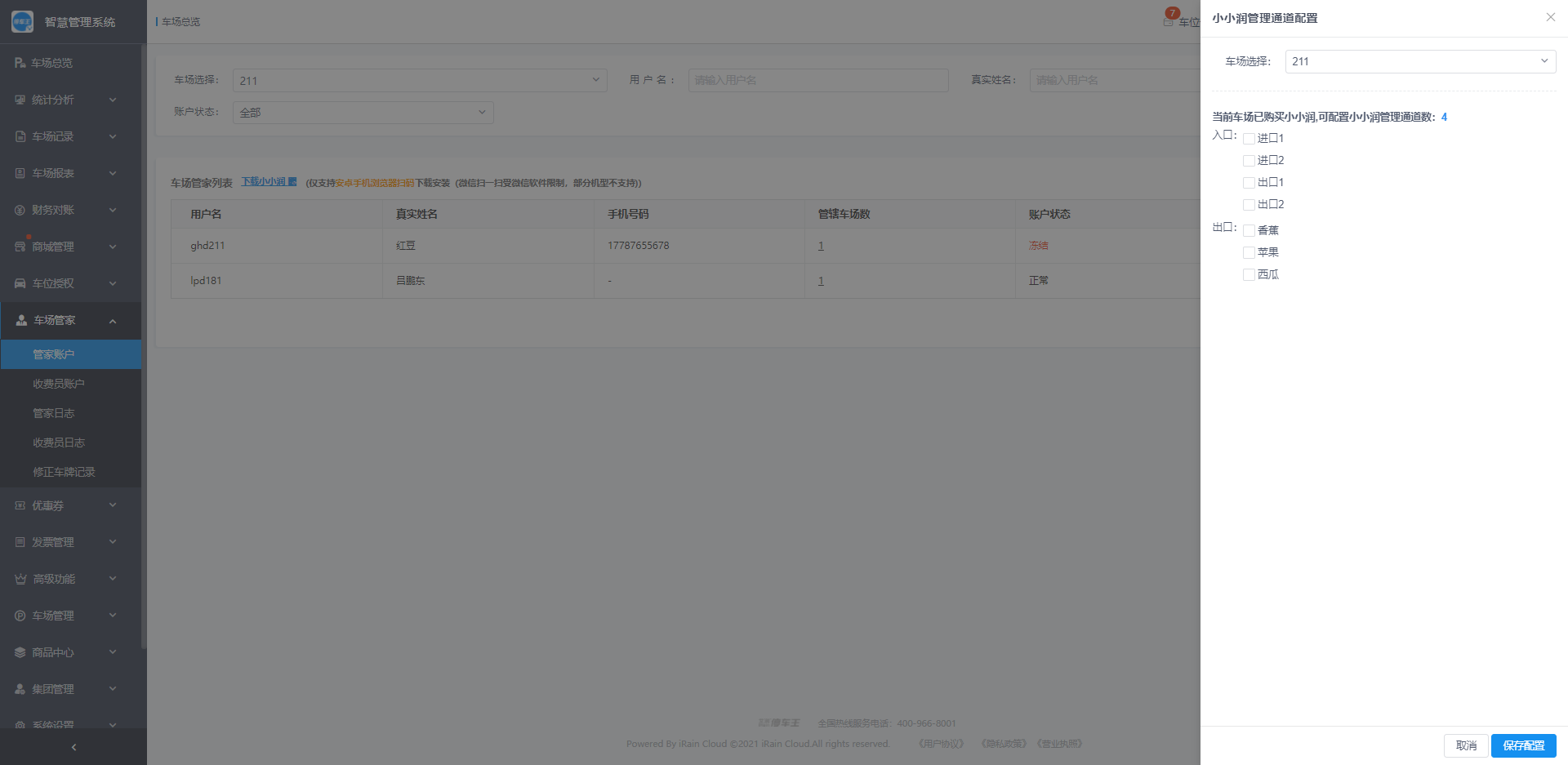 管家账户指的是小润(小小润)的账号管理,在管家账户功能模块,车场管理员可以新增、编辑、修改、删除管家账户,以及对车场小润进行通道信息配置;
