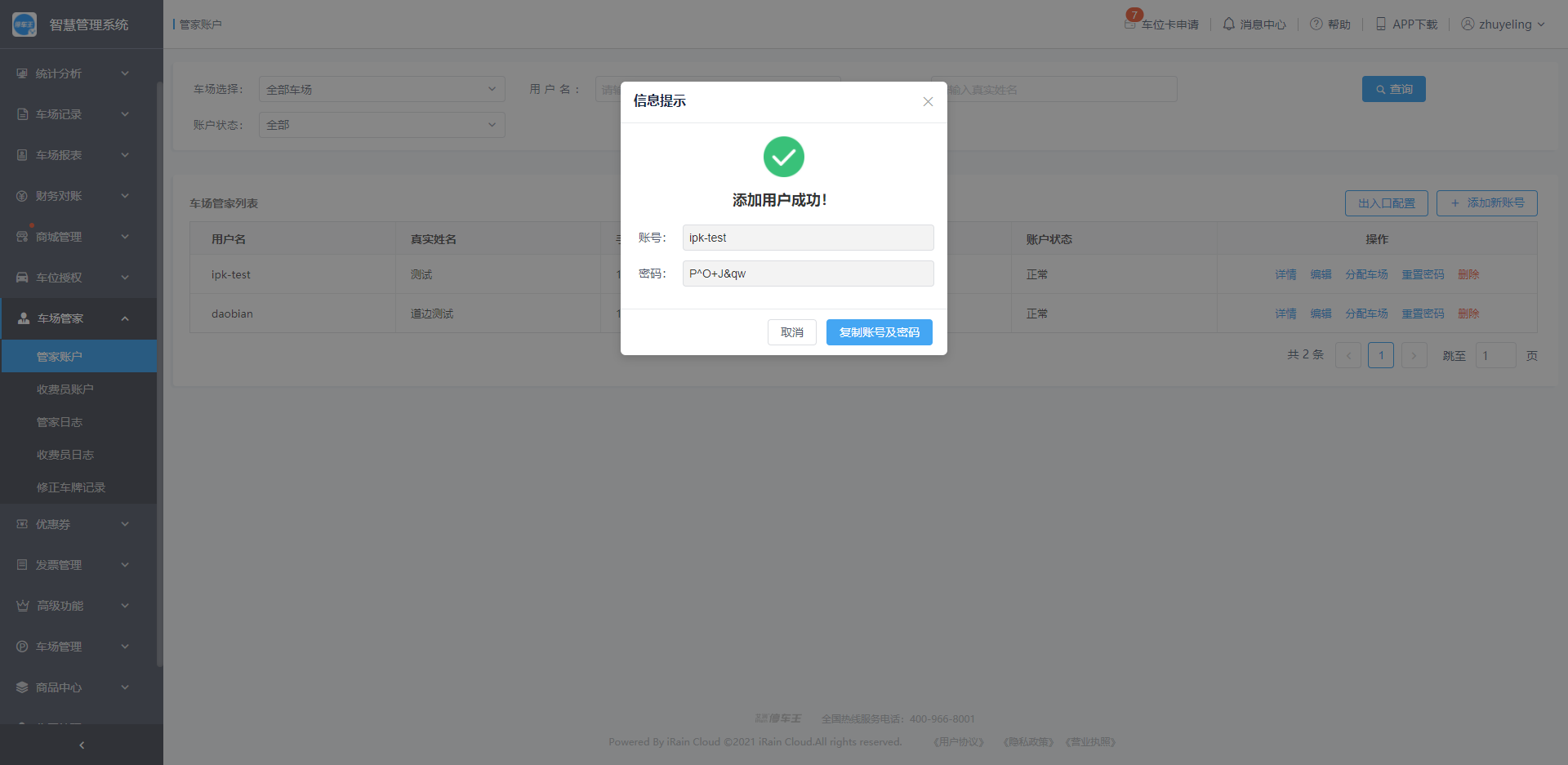 管家账户创建成功之后,可以复制账号及密码发送给相应的管家用户;