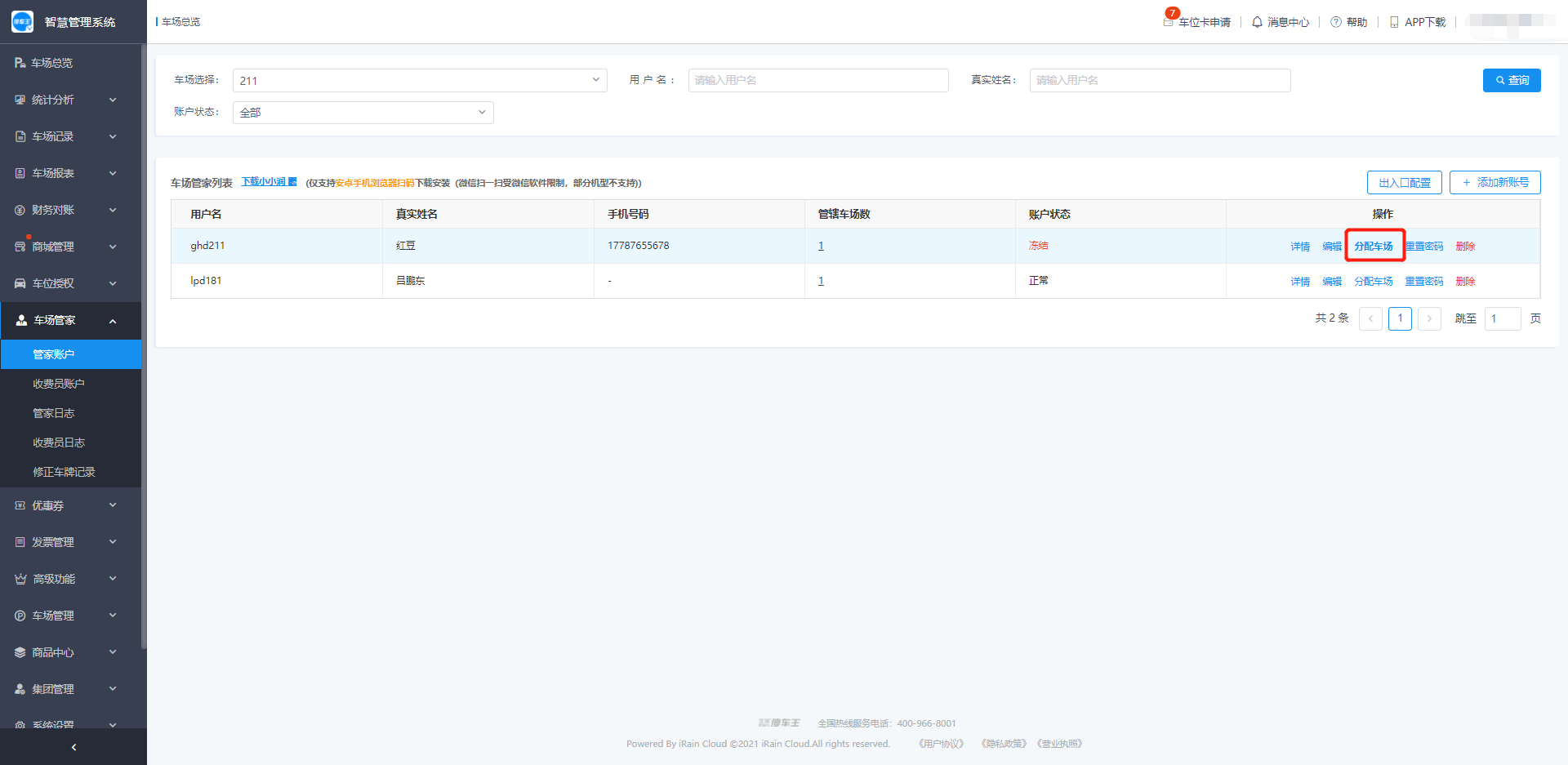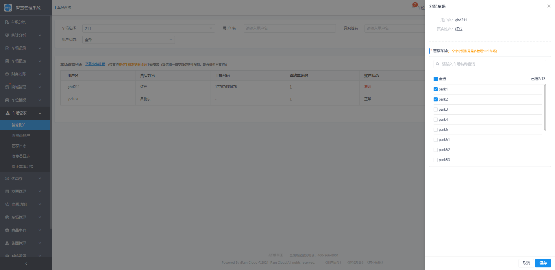 点击分配车场,可以为一个管家账户分配多个车场;