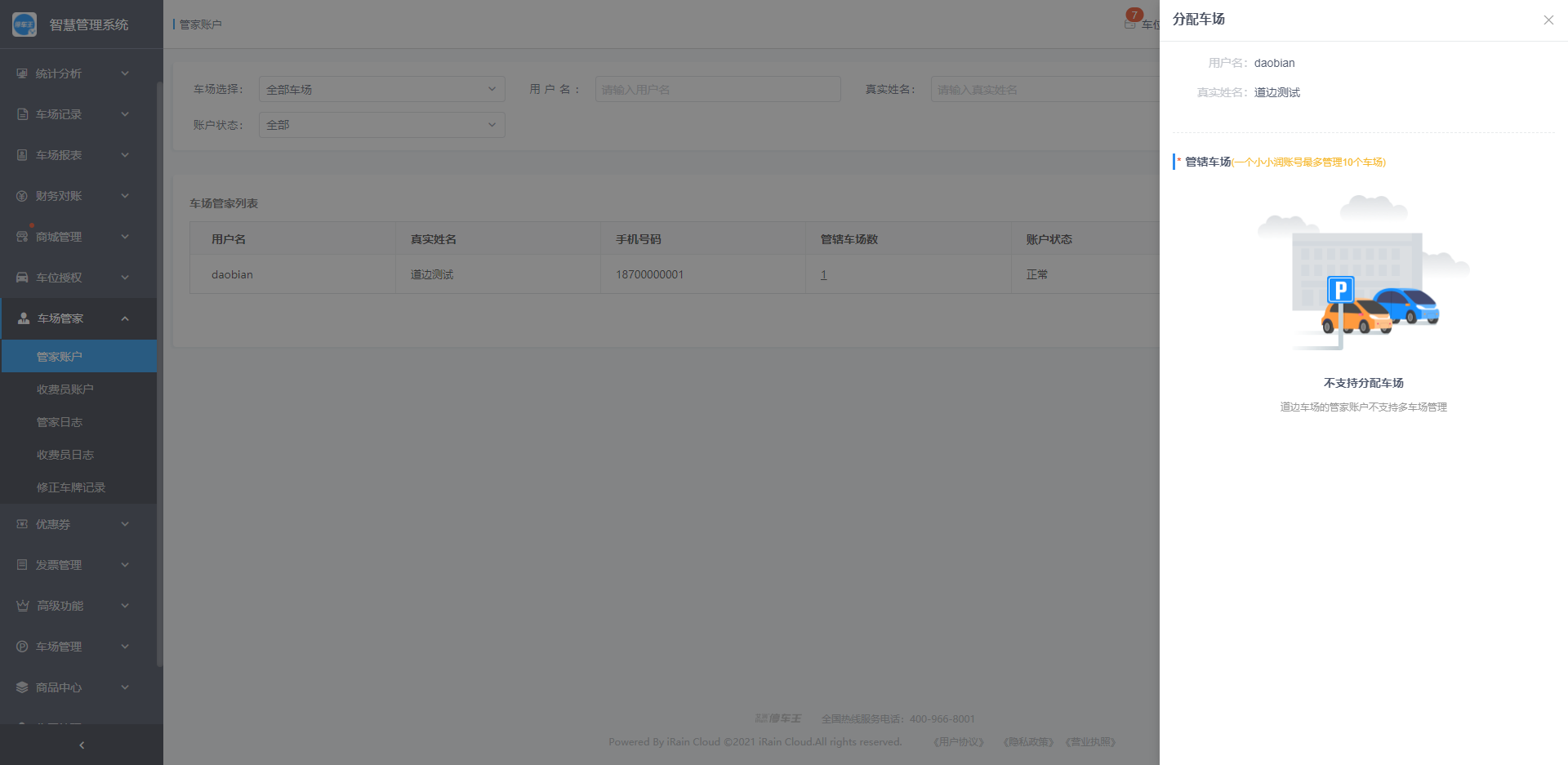 当前管家账户管理的车场若为“道边车场”时,点击“分配多车场”时,会提示道边车场管家账户不支持分配多车场;