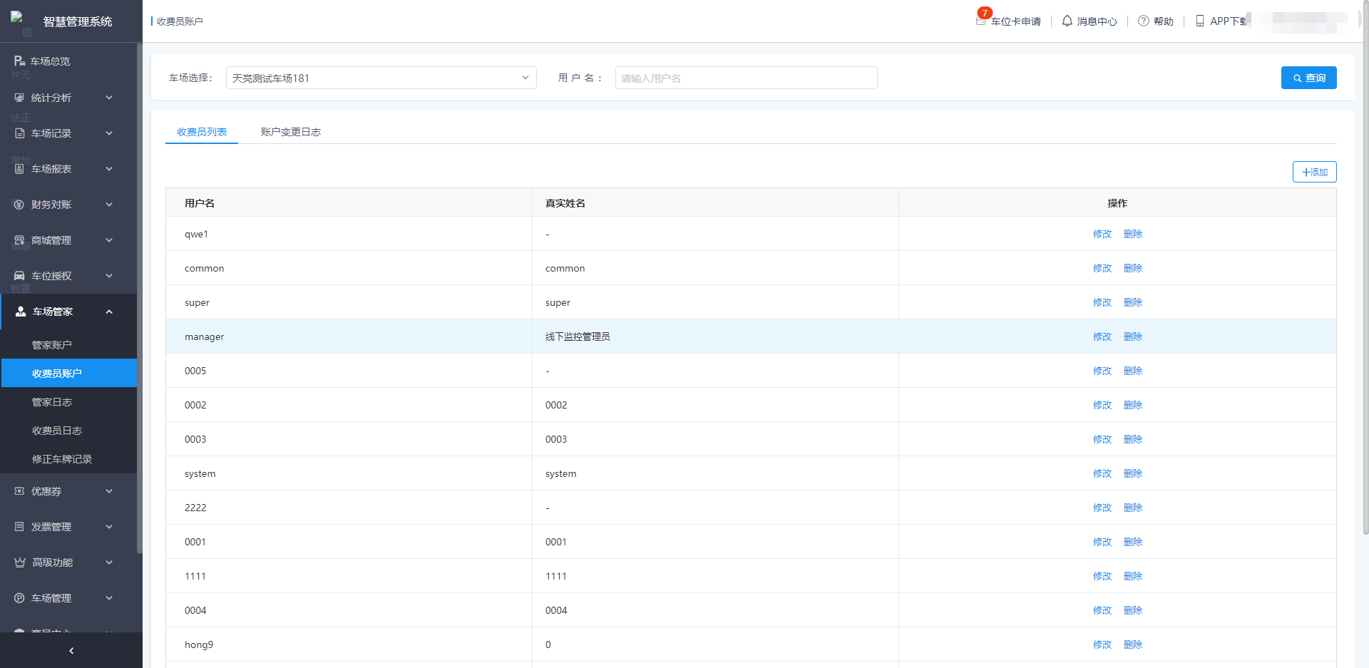 收费员列表展示了当前车场所有收费员账号信息,支持对收费员账号进行新增、编辑、删除操作;