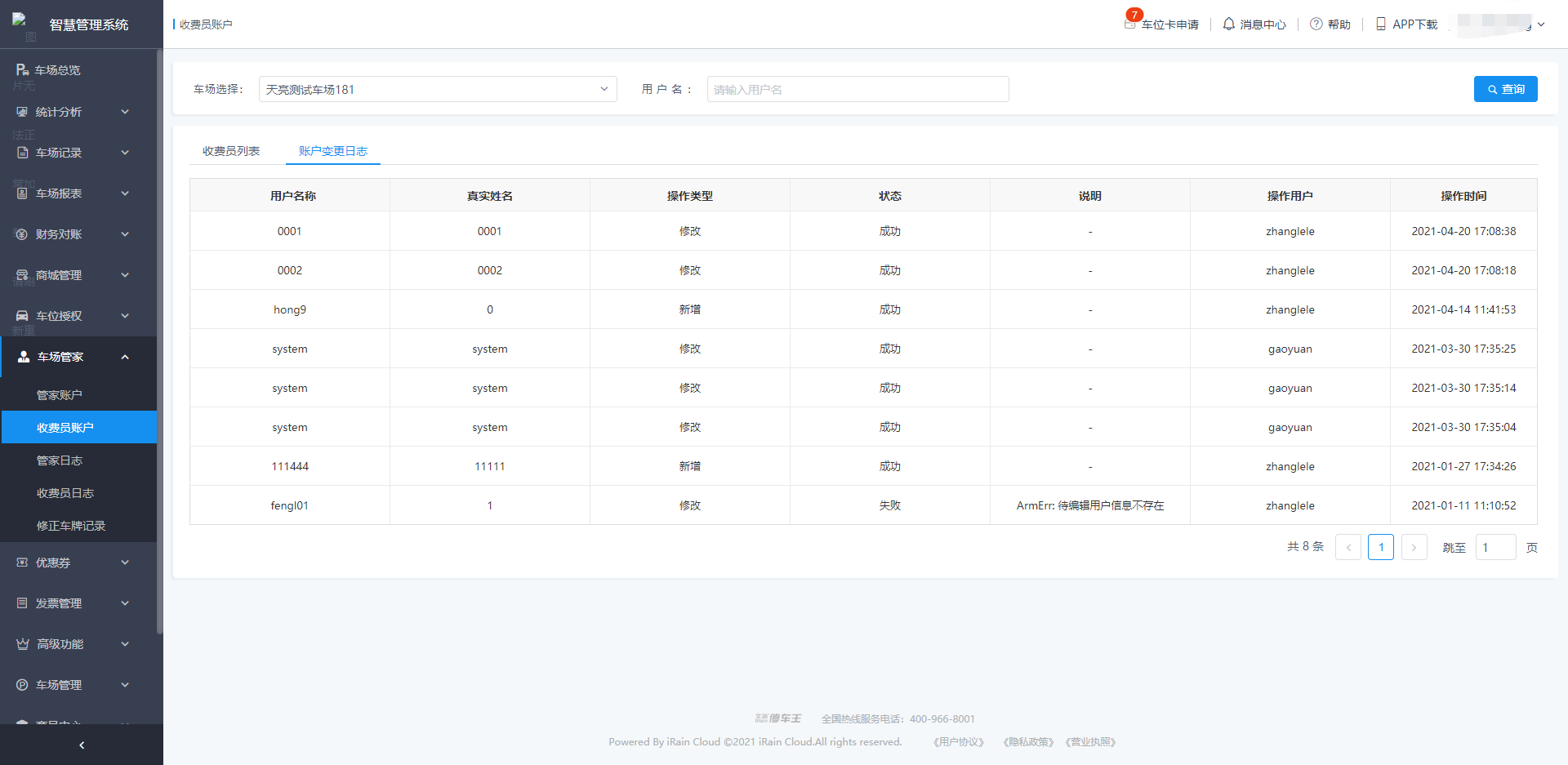 支持按照车场、操作时间、收费员账号、操作类型进筛选查询。