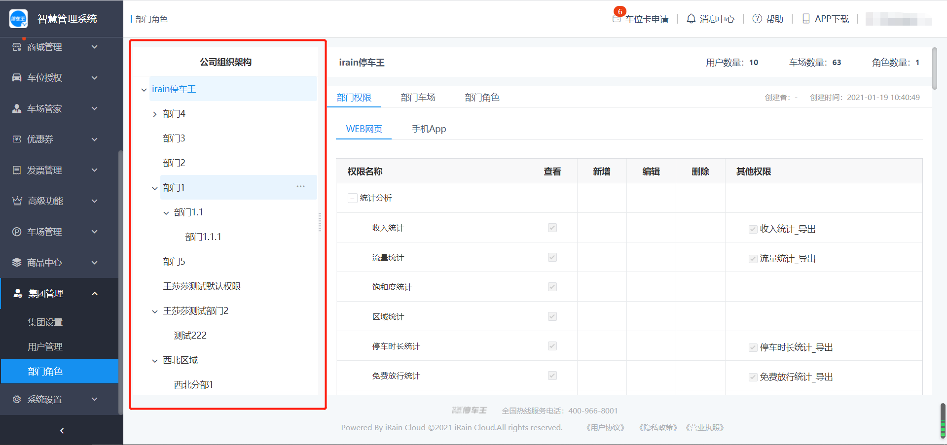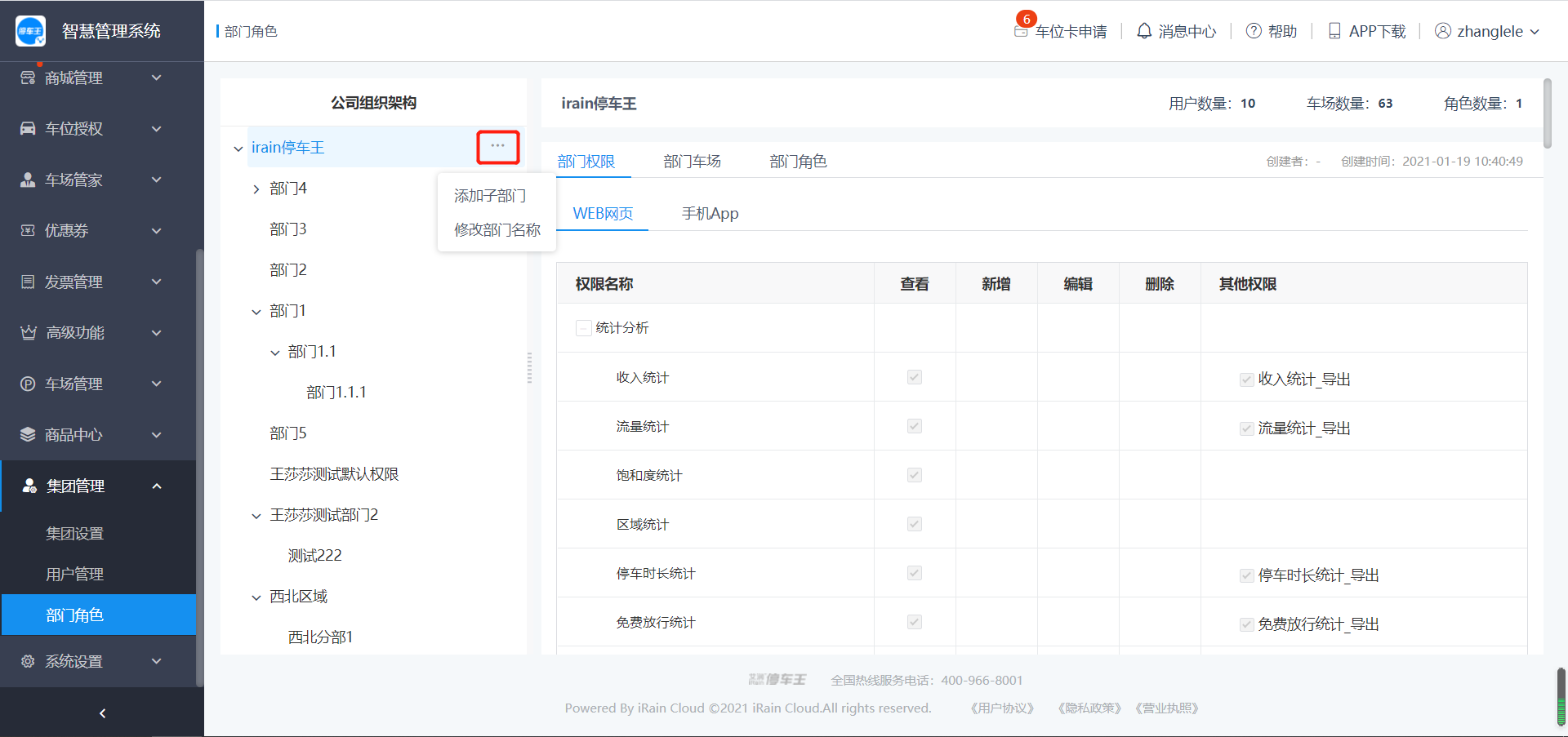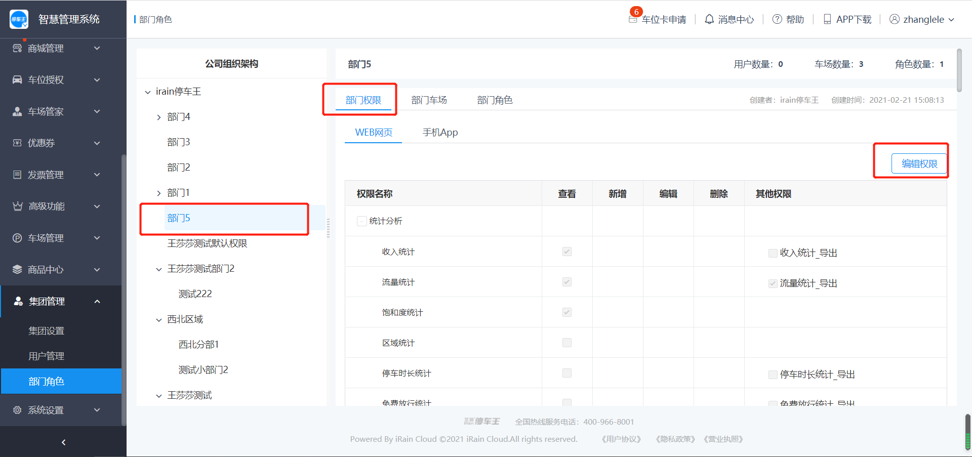 集团部门不支持修改权限、创建角色操作,默认拥有集团全部车场以及全部功能的权限;