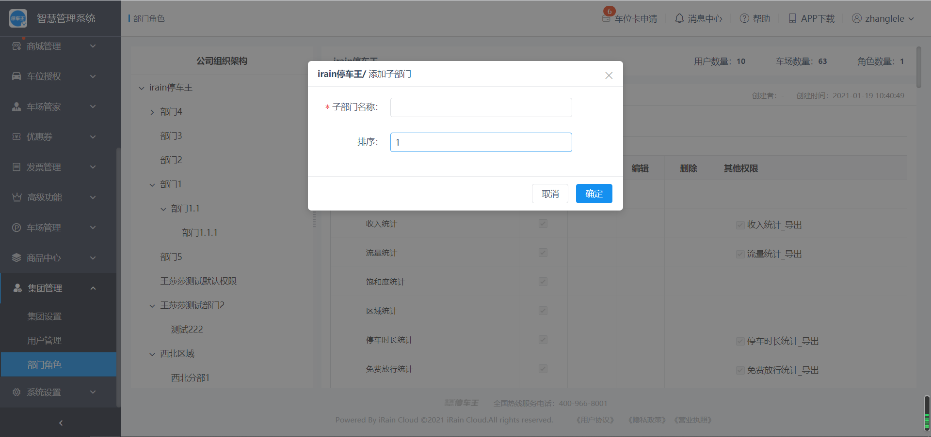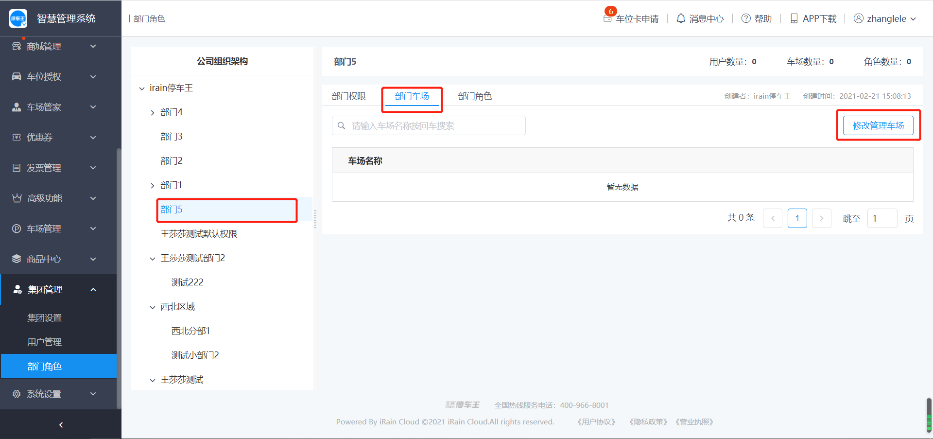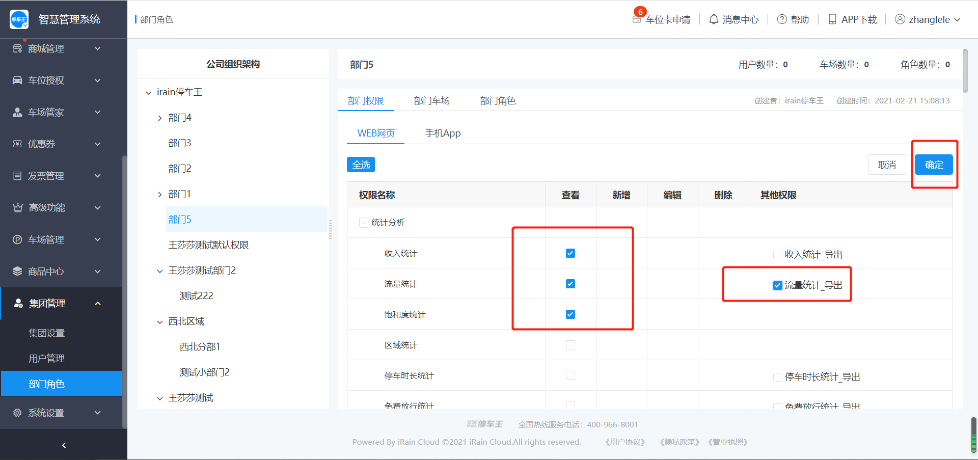 集团部门不支持修改权限、创建角色操作,默认拥有集团全部车场以及全部功能的权限;