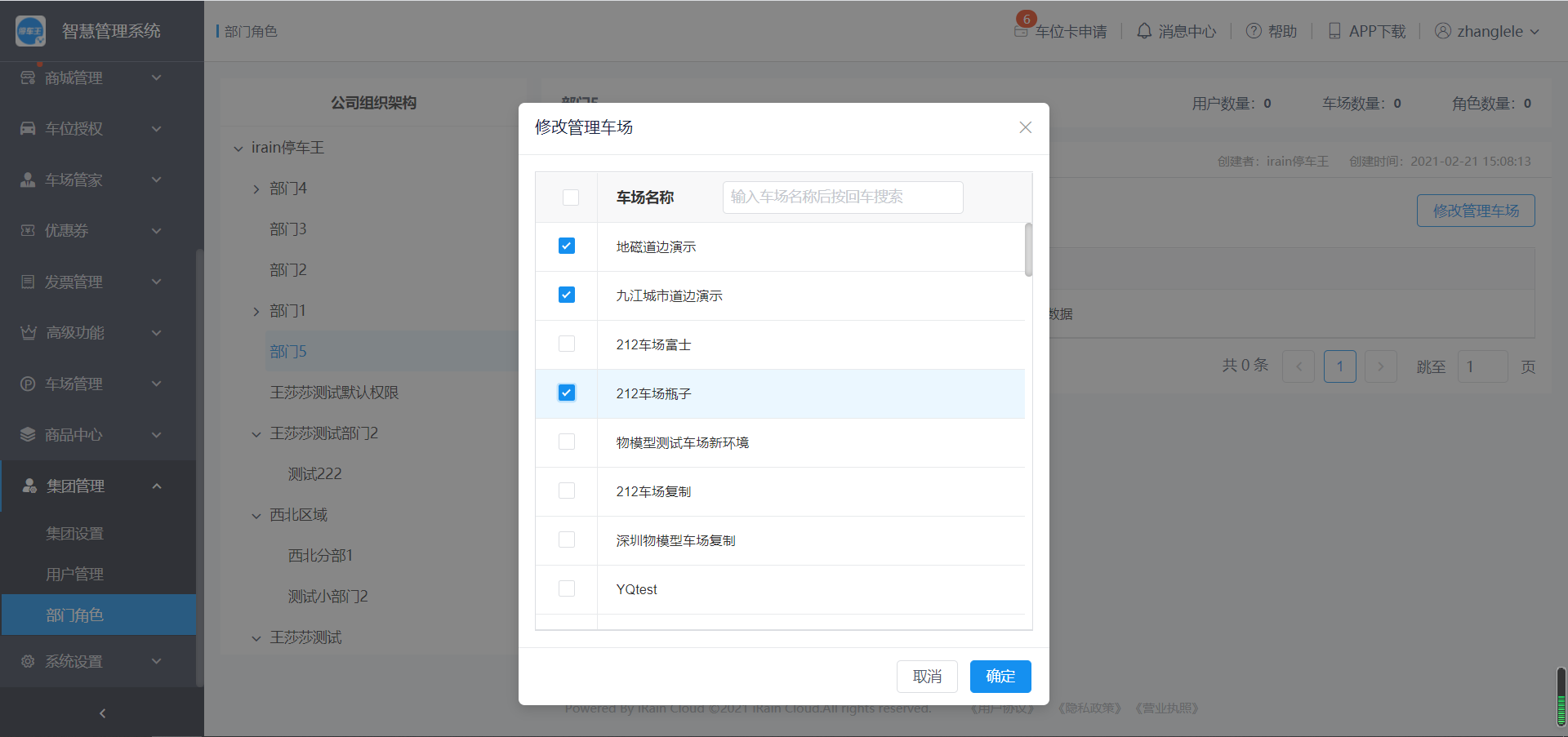 勾选该部门管理的车场,点击确定即可。