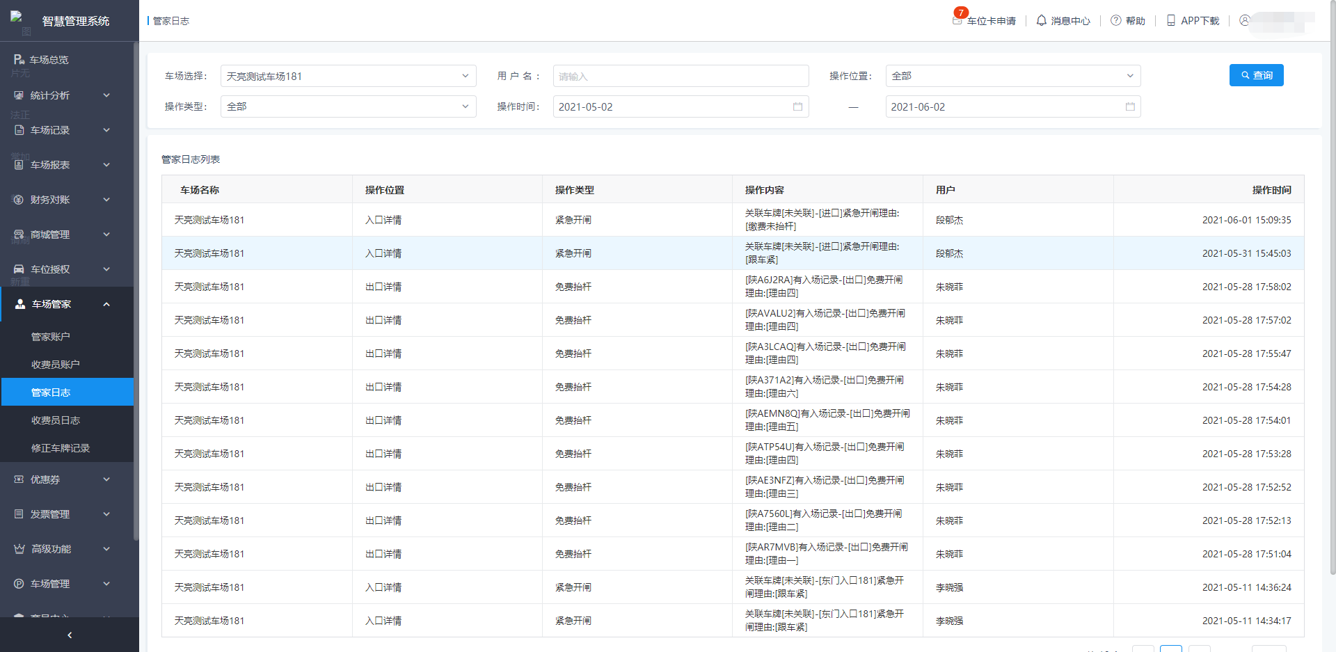 管家日志支持按照车场、操作时间、操作类型、操作用户等条件筛选查询管家的操作日志信息;