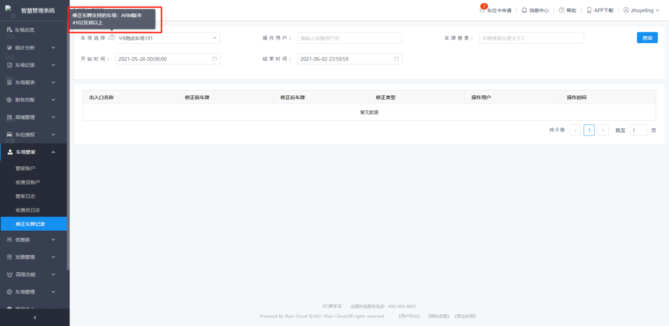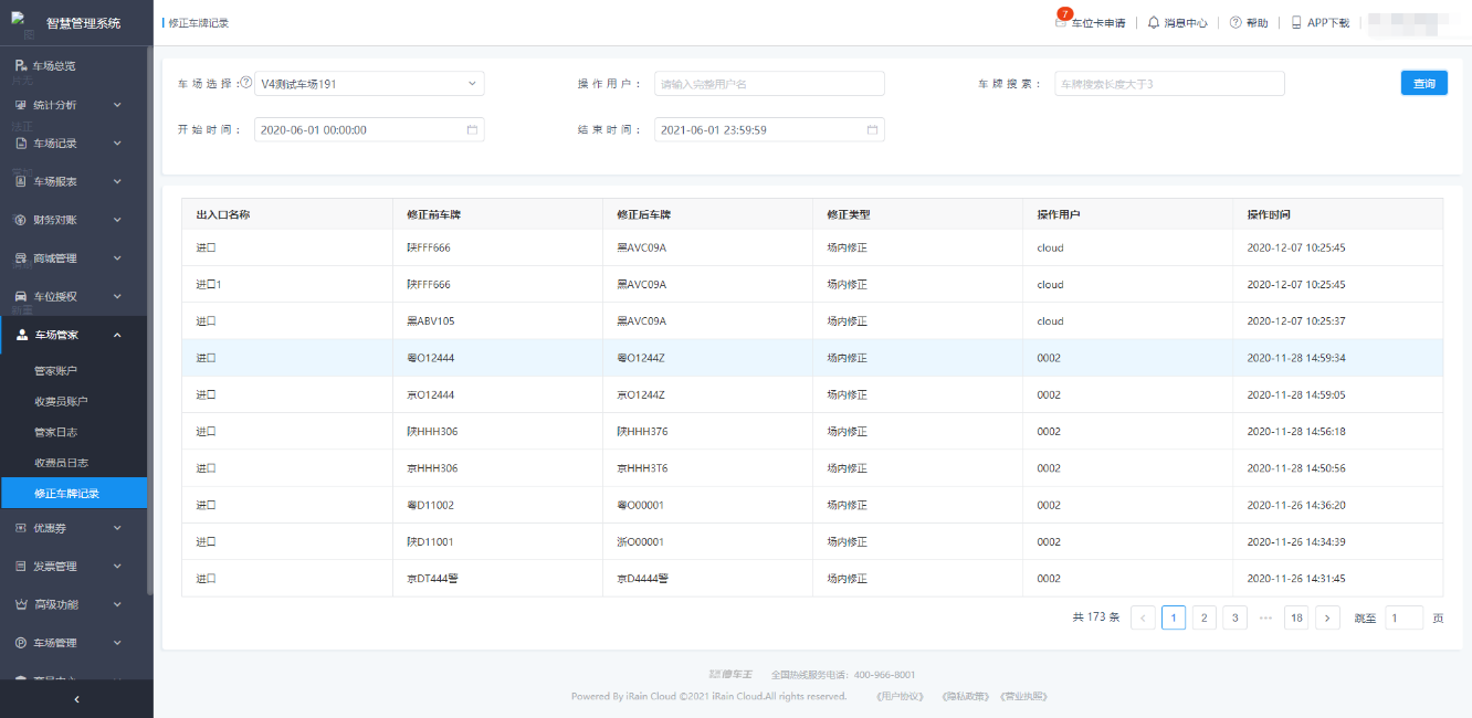 修正车牌记录列表中,记录了车牌修正前后的信息,以及修改车牌的位置、用户和时间;
