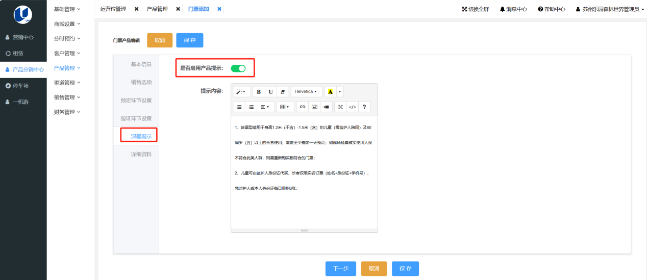 • 温馨提示对应小程序预定须知的内容,配置时一定要启用产品提示。如下两图所示。