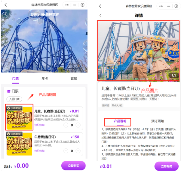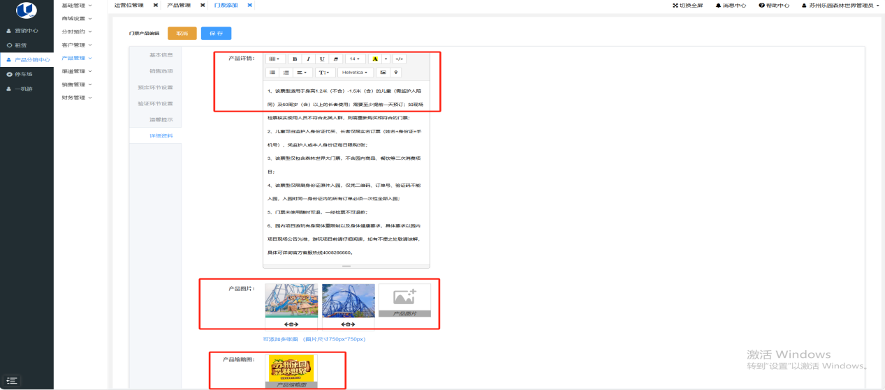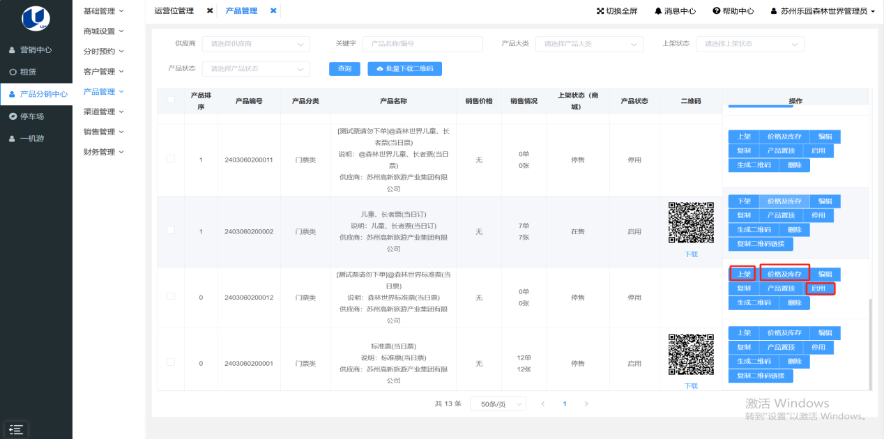 • 配置完成后保存即可,自动跳转到产品管理模块,点击价格及库存进行设置,无误后点击启用和上架,在小程序上显示该门票。