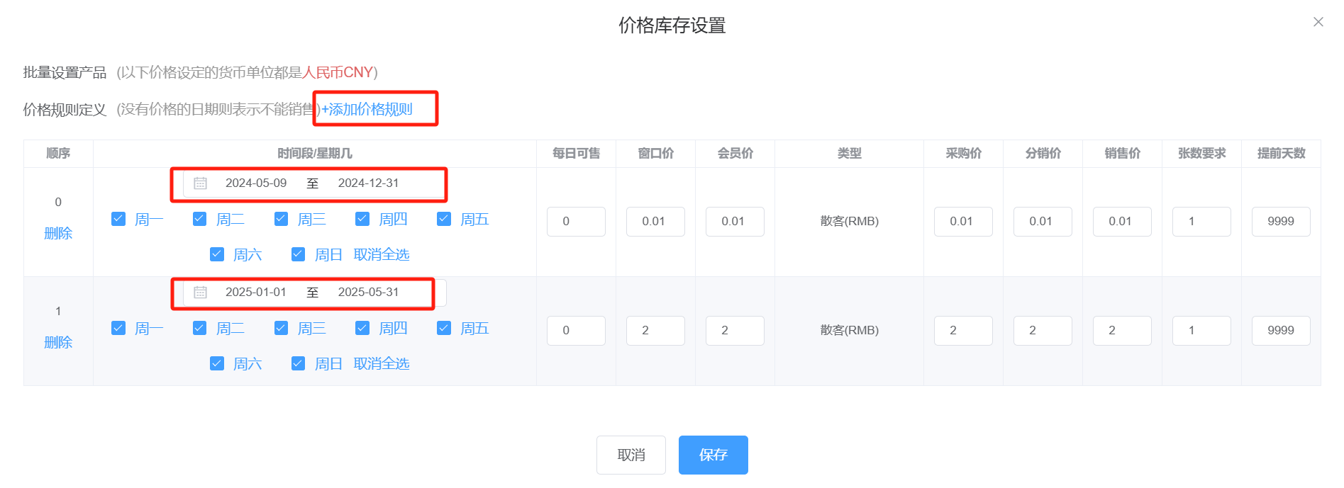 • 价格及库存进行设置时,点击添加价格规则,选择价格日期,并设定在周几售卖,不同时间不同价格的票可添加多条价格规则。其他按照需求填写。