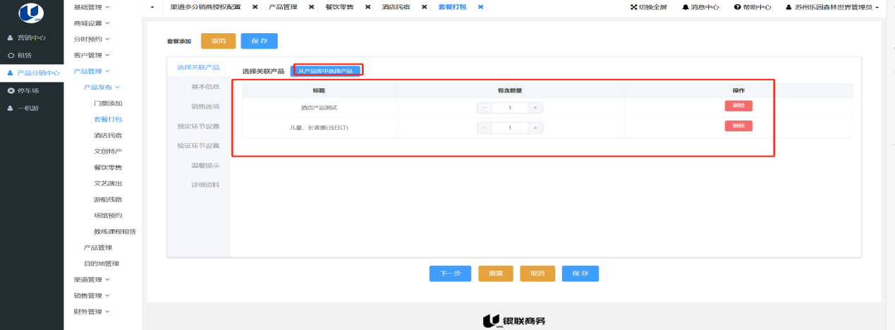 • 配置其他类型产品,如酒店、特产、餐饮等,同上述流程一样,按照提示内容填写即可。在进行套餐打包的时候,关联相关产品,无需填写内部编码,其他操作步骤同上。